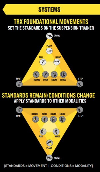 TRXの基礎動作は、スポーツトレーニングと日常生活の両方において重要な動作パターンを理解し、そして教えるための基本的な知識を提供するために作り出されました。プランクから始まり、プッシュ、プル、スクワットやその他、それぞれが、あらゆる環境で、いくつものトレーニング用のツールを利用して行う何百もの動作の基礎を作り上げます(これらの動作は私たちが行うほぼすべてのことを網羅しています)。私たちは、あなたがどのような様式を用いたとしても正しく、そして効果的にあらゆる人をもコーチングできるように(その人のスキルと関係なく)これらのコンセプトをより仔細にTRXの教育コースにおいて指導します。