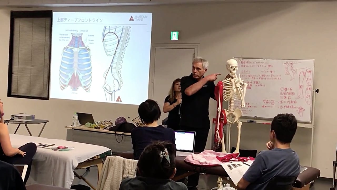 アナトミートレインのトム・マイヤーズが、ディープフロントラインの首のエリアに関しての解説をします。頚椎の適切な姿勢を維持するための斜角筋の役割をわかりやすく説明してくれています。