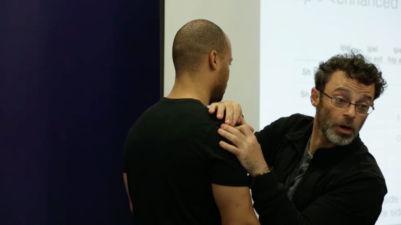 セミナー会場で、参加者をモデルに、理学療法士のアダム・ウルフが、上腕骨骨頭の位置と肩関節関節包の後部の幅を触診で計測し、左右差を確認するプロセスを紹介している場面からの抜粋です。肩甲骨の棘をランドマークにしてすぐに練習できそうですね。