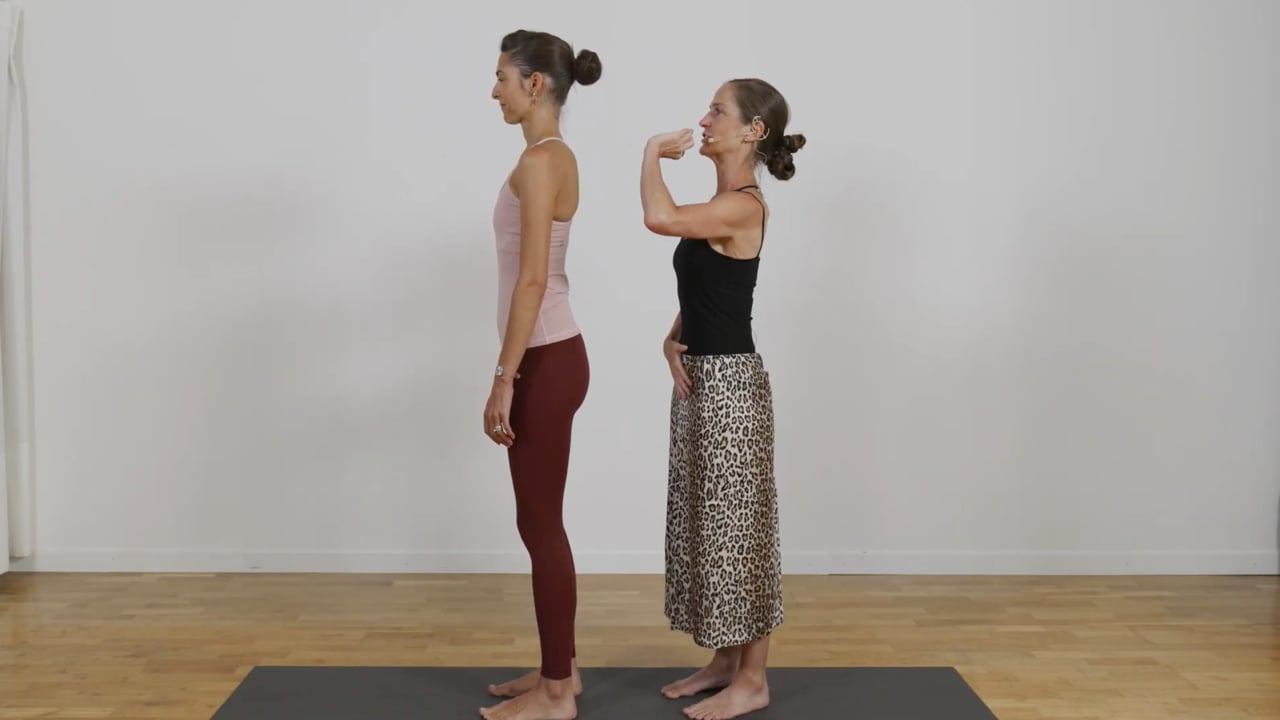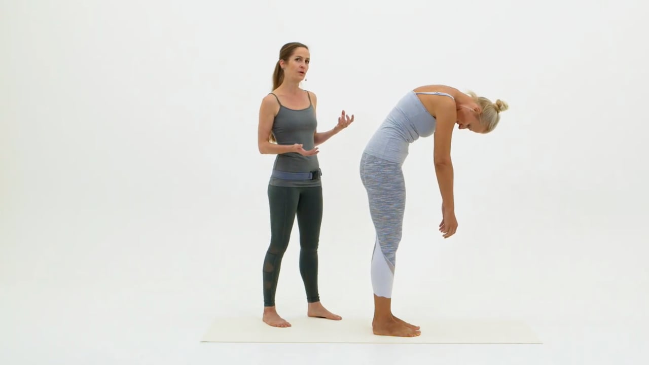 シンプルな立位からのロールダウンで脊椎、特に腰椎をオープンにすることを目指す場合と、脚部背面全体のストレッチを目指す時で、骨盤のアライメントがどう変化するのか?タクタイルキューイングはどのように変化するのか?カリンがニュアンスの相違を解説します。