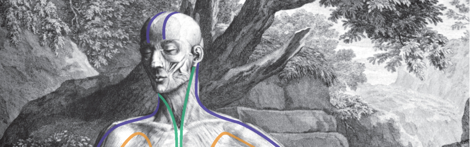 アナトミー・トレイン アナトミー・トレインとは、筋筋膜の外層を通る、機能的な力の伝達の主要な通り道を記そうと試みたものである(マイヤーズ 2009) 。アナトミー・トレインは、鍼治療における経線と共通する要素を持つものの、その基礎となっているのは、西洋の筋膜解剖学である。筋筋膜経線を作るためには、下記が必須となる。 ひとつの構造から他の構造へと、筋筋膜の生地の目を辿るようにする。 できるだけ、まっすぐのラインをとる('滑車'を介さない限り、コーナーを通ることはできない)。 力の伝達を妨げる、筋膜の壁を途中で通り抜けない。 図1)アルビナスのよく知られた絵にアナトミー・トレインの図を重ねている。 この手法を用いることで、他章で詳しく解説した、筋筋膜のアウターバッグを通る12組のコネクションを見つけることができる(マイヤーズ 2009, AnatomyTrains.com)。総体的に言えば、身体の前、後ろ、側面、体幹の周囲やアーチの下、腕に沿って、反対側の肩帯と骨盤帯、脚や体幹のコアを通る、解剖可能なはっきりとした筋筋膜の繋がりのラインが存在する。 それぞれのラインに関わる筋膜、筋筋膜、軟部組織の構造は下記の通り。ラインを構成している個々の筋肉の付着部は、アナトミートレインの理論では、ステーション=駅となる。これらの連結部において、ラインが骨膜や靭帯といったインナーバッグに接続していたとしても、力の伝達は筋肉の付着部を越えて、筋膜によって伝達される。力の伝達の程度、タイミングや詳細なメカニズムは計測されたり解明されてはいないものの、筋肉と筋肉は筋膜によって連結しているということは考慮する価値のあることである、というのは既にエビデンスによっても支持されていることである。この考え方は、筋肉は骨に付着している、という狭義な認識に有益に付加されうるかもしれない。体内で骨に直接骨に付着している筋肉などひとつもない。筋肉は常に結合組織の構造を介して骨に付着しているのである(ヴァンデルワール 2009)。 スーパーフィシャルフロントライン: 足趾伸筋群、前下腿区画、大腿四頭筋、腹直筋と腹腱膜、胸骨筋と胸骨軟骨筋膜、胸鎖乳突筋 スーパーフィシャルバックライン: 短趾屈筋群と足底腱膜、下腿三頭筋、ハムストリングス、仙結節靭帯、腰仙筋膜、脊柱起立筋、帽状腱膜 ラテラルライン: 腓骨筋群、外側下腿区画、腸脛靭帯、股関節外転筋群、外腹斜筋、内外肋間筋、胸鎖乳突筋および板状筋 スパイラルライン: 板状筋、(反対側)菱形筋、前鋸筋、外腹斜筋、(反対側)内腹斜筋、大腿筋膜張筋、腸脛靭帯前部、前脛骨筋、長腓骨筋、大腿二頭筋、仙結節靭帯、脊柱起立筋 スーパーフィシャルバックアームライン:僧帽筋、三角筋、外側筋間中隔、手根・手指伸筋群 ディープバックアームライン: 菱形筋、肩甲挙筋、ローテーターカフ、上腕三頭筋、尺骨筋膜、内側側副靭帯、小指球筋群 スーパーフィシャルフロントアームライン: 大胸筋、広背筋、内側筋間中隔、手根・手指屈筋群、手根管 ディープフロントアームライン: 小胸筋、鎖骨胸筋筋膜、上腕二頭筋、橈骨筋膜、外側側副靭帯、拇指球筋群 フロントファンクショナルライン: 大胸筋(下縁)、半月線、錐体筋、股関節内転筋群(長内転筋、短内転筋、恥骨筋) バックファンクショナルライン: 広背筋、腰仙筋膜、大殿筋、外側広筋 イプシラテラルファンクショナルライン: 広背筋(外側縁)、外腹斜筋、縫工筋 ディープフロントライン: 後脛骨筋、長趾屈筋群、深後区画、膝窩筋、後膝関節包、内転筋群、骨盤底、前縦靭帯、腰筋、腸骨筋、腰方形筋、横隔膜、縦隔、舌骨筋複合体、口腔底、口顎筋群 ここで確認しておいて欲しいのは、現時点において、アナトミー・トレインは単なる図式であり、地図にしかすぎないということである。臨床的観察や常識、そしていくつかの解剖によって支えられてはいるものの、これらのラインを通る力の伝達の程度は、未だ数値として確認されておらず、科学的に証明されるレベルにはまだ到達していない。アナトミー・トレインは、治療の方法ではないが、理学療法やリハビリ、パーソナルトレーニング、パフォーマンストレーニング、そしてあらゆるタイプの徒手療法においての身体の見方の助けとなる方法のひとつであるということも忘れてはならない。 それぞれの筋筋膜経線は、そこに含まれる筋肉各々が持っている機能を超えた機能を備えているようであり、それらの経線の中には、人間の経験における"意味"を与え得るものもある。この主観的ではあるものの駆り立てられる要素は、臨床においても観察され、ストレスを受けたり損傷した部位の組織の修復に、セラピストが適用する全体的な計画の提唱ともなりえる。 このシステムを簡略に見てみよう。スーパーフィシャルフロントライン (爪先から乳様突起までを通るライン) は、しばしば慢性的な恐怖のパターン(驚愕反応)によって短縮する。科学的な証明はされ