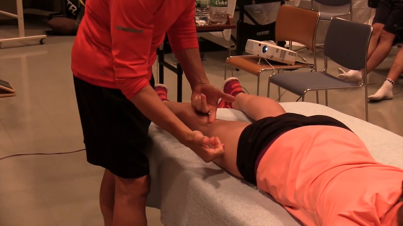 2014年10月8日&9日に東京で開催されたセミナーから。下腿部外側の組織へのハンズオンワークから、コンプレッションバンドを使用して更に組織への水和作用を高めた後、アクティブな動きによる組織の強化を行います。