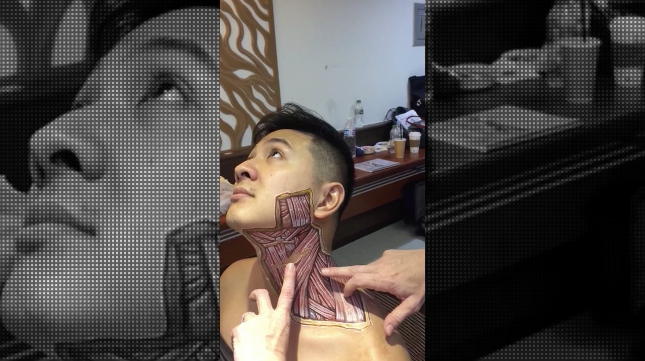 イマキュレートダイセクション、レベル4のクラスから、頸部前側の領域にある、舌骨上筋群や舌骨下筋群などを始めとする、複雑な構造を、ダニー・クァークによる素晴らしいボディペインティングで、実際に動きとともに観察することで理解する。素晴らしい解剖学の学習方法です。