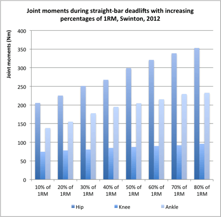 研究者たちは、ストレートバーデッドリフトの際、負荷の増加に伴い股関節、膝関節、および足関節のモーメントが増加したということを報告している。しかしそれらは全てが均等に迅速に増加したわけではない。下記のグラフに示されているように、股関節モーメントは負荷の増加と共に最も速く増加し、足関節、膝関節の順に後に続いていた。