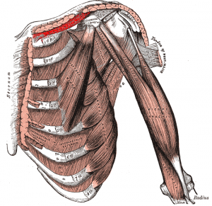 投手によく見られるトリガーポイントを探しているのなら、鎖骨下筋を見逃さないでください。鎖骨と第一肋骨(赤でハイライトしています)の間に挟まっている筋肉です。